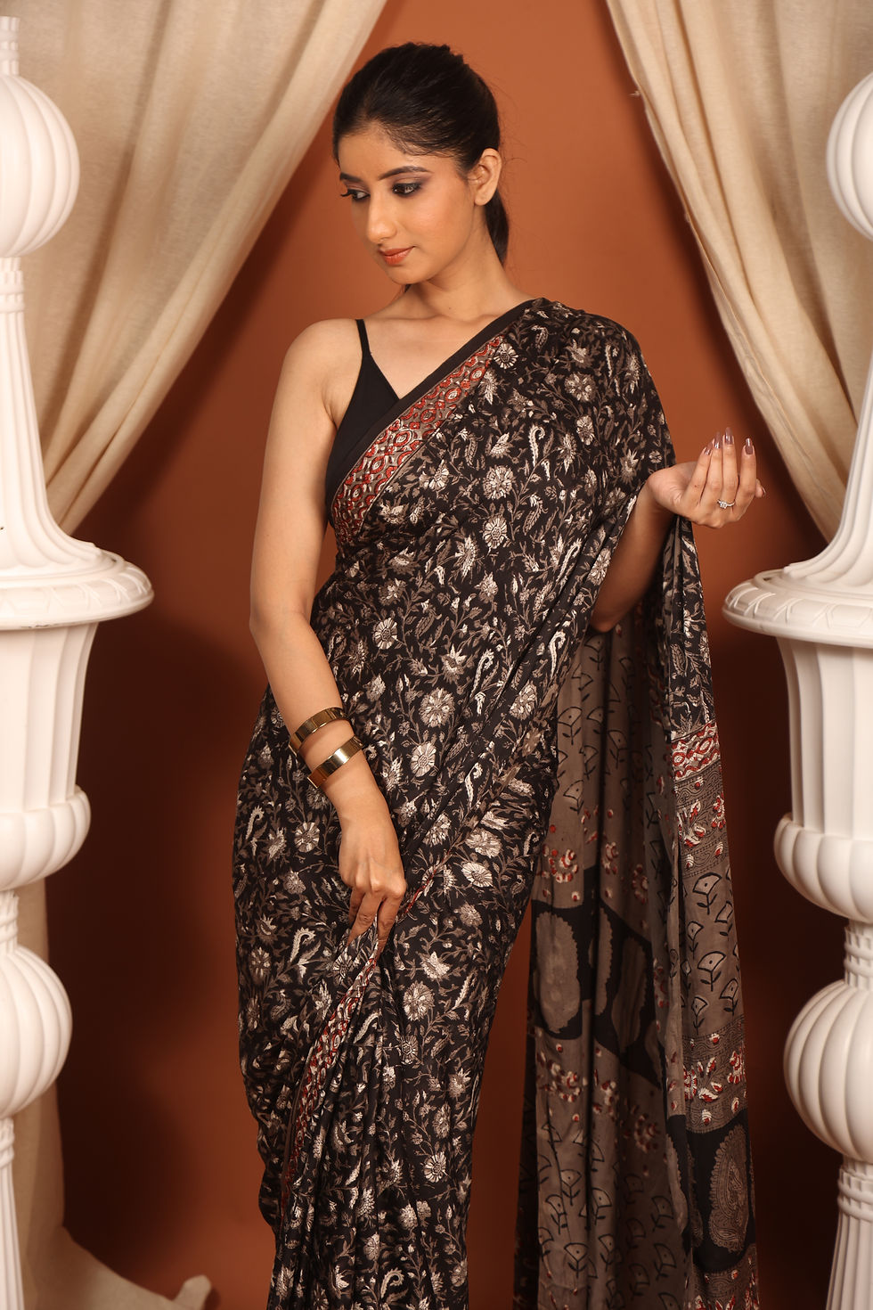 Delicate yet striking, this cream and red Ajrakh saree showcases exquisite Mughal floral motifs on lustrous modal silk. Its timeless palette makes it perfect for both traditional festivities and elegant daywear.